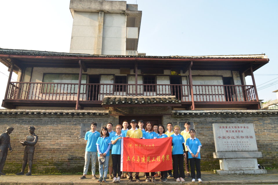 7月17日上午,桂林理工大学土木与建筑工程学院兴安“寻红色足迹,走好新时代长征路”实践队从界首出发坐车前往兴安县华江瑶族乡,在华江瑶族乡中学里面搭建一个临时住所,中午从中学出发徒步前往湘江战役旧址千家寺红军标语楼探访红军标语遗迹现状,挖掘标语背后的故事,再从华江中学后山,一个叫“打靶场”的山上去往红军烈士纪念塔,历经两个多小时到达朱德指挥部旧址——衡州会馆,临近天黑之时徒步下山。