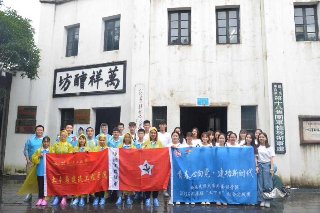 我团队在桂林八办巧遇西南民族大学的社会实践队伍,他们是成都来到桂林参观八路军桂林办事处,在参观的过程中,两大高校对于革命先烈们英勇顽强、不不屈不挠的斗争精神,敢于献身、舍生赴死的大无畏精神都表示深刻的肯定,学生们都表示应该不忘历史,牢记过去,为中华的繁荣富强而不懈拼搏,为实现中华民族伟大复兴的中国梦而努力奋斗。最后两大高校实践成员在八路军桂林办事处门前拍照留念,并表示以后两校保持密切合作与交流。