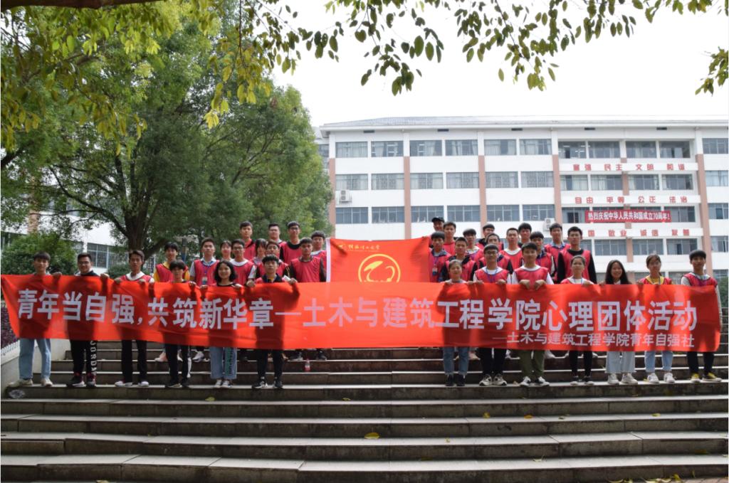为了庆祝新中国成立七十周年,弘扬爱国精神,同时也为了加强同学们彼此之间的交流与沟通,增进同学们之间的感情,桂林理工大学土木与建筑工程学院青年自强社于11月17日在雁山校区三栋艺术广场举办了“青年当自强,共筑新华章”心理团体活动。