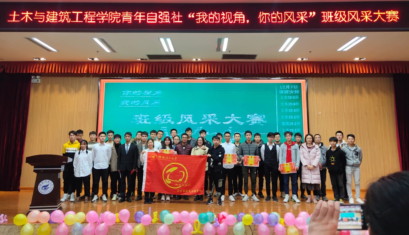 为了推动土建学院19级班级学风建设,加强校园精神文明建设,由桂林理工大学土建青年自强社于12月7日在雁山图书馆报告厅举办“我的视角,你的风采”班级风采展示大赛,本次大赛的结果是线上和线下的综合评分是最终的得分。出席本次活动并担任线下评委的有19级辅导员安邦国老师和彭思思老师,土建团委学生会新闻信息部肖规一,土建团委学生会科技部张东荣,土建青年传媒中心邹伟林和黄继嘉以及青年自强社社长梁衍照。