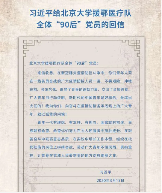 习近平总书记给北京大学援鄂医疗队全体“90后”党员回信内容