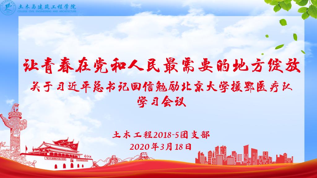 3月18日,为积极响应学校团委号召,土木工程2018-5团支部在QQ班群群课堂里积极开展以“学习领悟习近平总书记给北京大学援鄂医疗队全体‘90后’党员回信精神”为主题的线上团学活动。