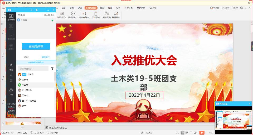 为推荐优秀团员作为党的发展对象,培养合格的社会主义接班人,加强党的队伍建设。2020年4月22日晚上,土木类2019-5班团支部入党推优线上大会顺利召开。土木类2019-5班班主任唐丽华老师、辅导员安邦国老师、团支部全体成员以及组织部成员参加了本次会议,团支书王德福主持会议。