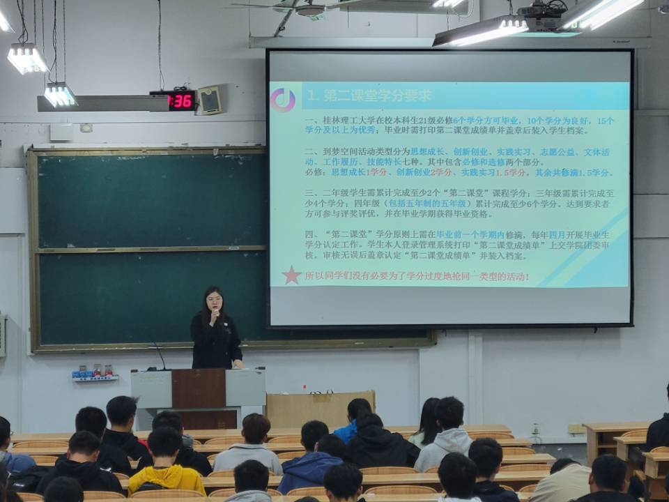 培训会上,学院团委、学生会社会实践部干事向2021级新生介绍了我校实行的第二课堂成绩单制度,并指出了该制度培养大学生综合素质、深度融入教育改革发展、服务国家经济发展大局的本质。其中,讲解员重点讲解了学校的第二课堂学分制度和对学分获取途径、不同学年制学分成绩的规定及学分分值认定标准的内容,同时向2021级新生说明了学校举办的各式各样的活动都与第二课堂成绩息息相关,同学们都可以通过到梦空间进行活动的报名参与并获得相应的学分。