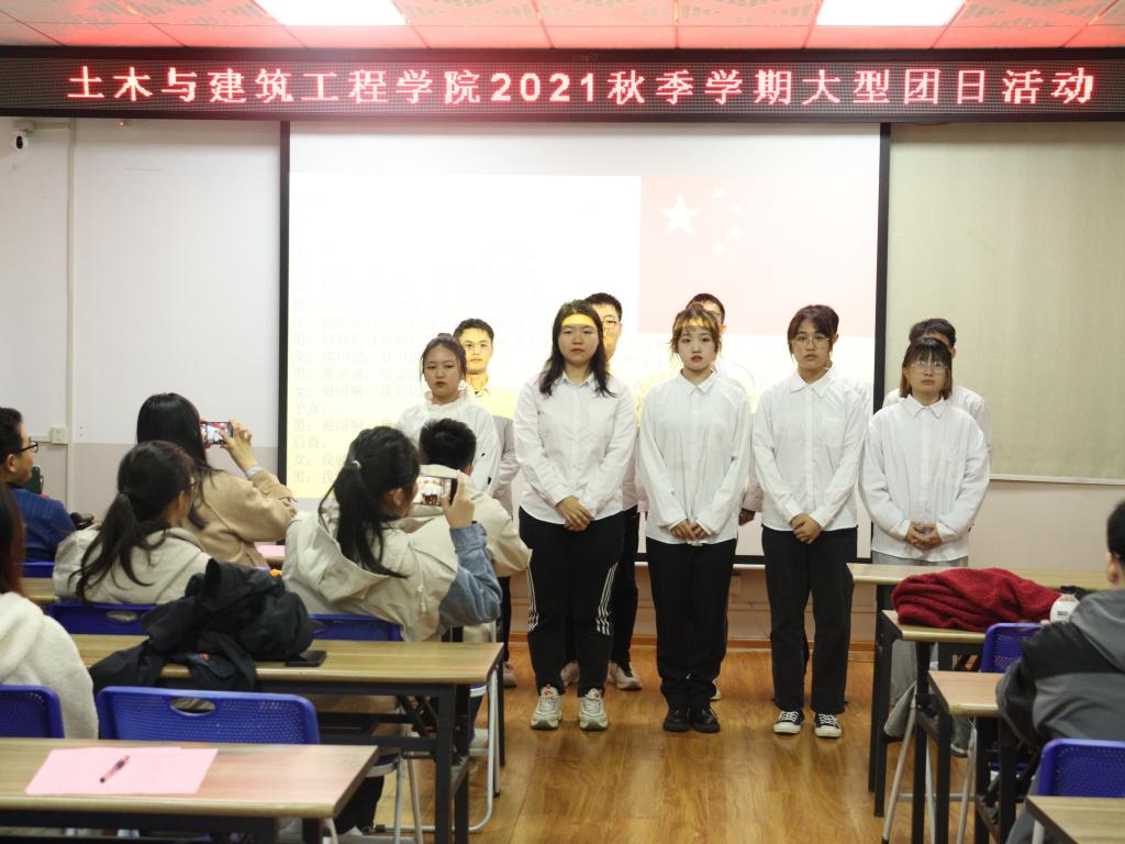 活动开始,与会人员全体起立,奏唱团歌《光荣啊!中国共青团》,紧接播放由共青团为纪念为守卫祖国边界而牺牲的戍边战士而精心制作的微电影《重逢》,电影情节波澜起伏,对保家卫国的每一代青年人表达敬意,对新一代青年也给予肯定的回答;电影的深刻寓意,同学们对此都深有感触,争相发表自己的观影感受。随后,由城乡规划2020-1班团支部的同学上台进行诗歌朗诵,表达对祖国的热爱之情。紧接着进行党史抢答互动环节,同学们积极思考,争先抢答。随后谢基柱老师对本次活动进行点评,鼓励同学们在今后的生活中努力学习,做新一代青年榜样,全体成员重温入团誓词后结束本次活动。