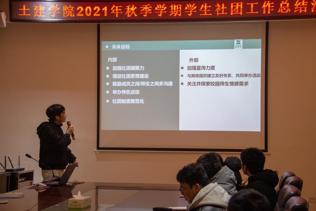 会上,学院11个学生社团负责人依次进行2021年秋季学期工作进行总结汇报,各学生社团主要围绕内部组织建情况、学生活动开展情况、工作主要成果、存在的不足与问题分析,以及对2022年重点工作规划进行总结汇报,讲常规、讲特色、讲不足、讲发展,充分展现了学院学生社团的风采。