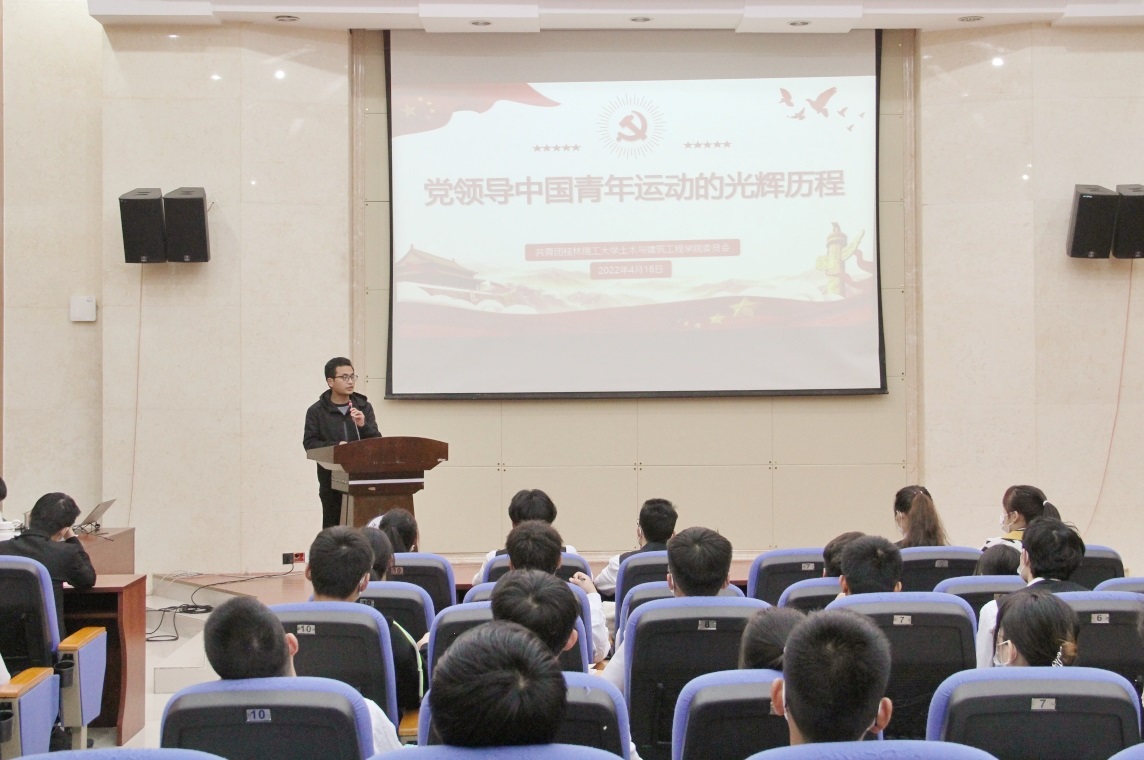 为深入学习宣传贯彻习近平新时代中国特色社会主义思想,营造迎接宣传贯彻党的二十大的浓厚氛围,引导团员青年坚定跟党走、奋进新征程,学院于2022年4月16日在雁山校区12栋萃华楼报告厅开展“党的青年运动史”主题团课,团课由学校青年讲师团讲师、学院团委副书记(兼)安邦国老师主讲,学院团委、学生会全体成员参加专题团课学习。