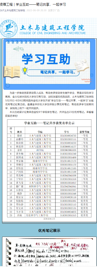 系列二,开展“学业互助——笔记共享,一起学习”活动,土木与建筑工程学院5月20日-6月6日面向全校大学生开展“学业互助——笔记共享,一起学习”主题优秀笔记征集活动。邀请全体在校大学生积极分享优秀笔记,帮助更多学习困难同学,实现线上线下一起共同进步。本次活动累计征集来自全校9个学院学生笔记,评选出23份优秀笔记进行线上线下宣传。