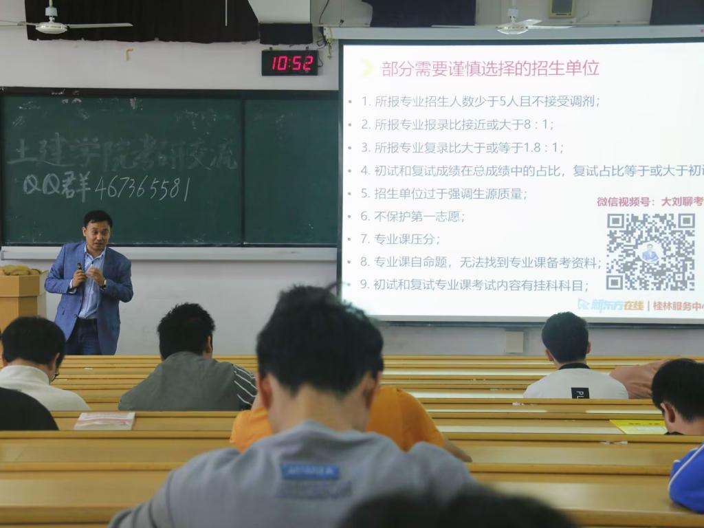 在刘老师的介绍和开场词引入下,讲座拉开序幕,全体成员认真聆听。刘老师依据多组数据来分析近年来的考研状况与趋势,同时结合人才市场需求变化引出了考研日益广泛化、激烈化的变化趋势,让同学们清楚认识到考研的重要性与必要性。最后,刘老师对本次考研公益讲座作出了总结,还让同学们加入QQ群,以便为日后的疑问进行解答。