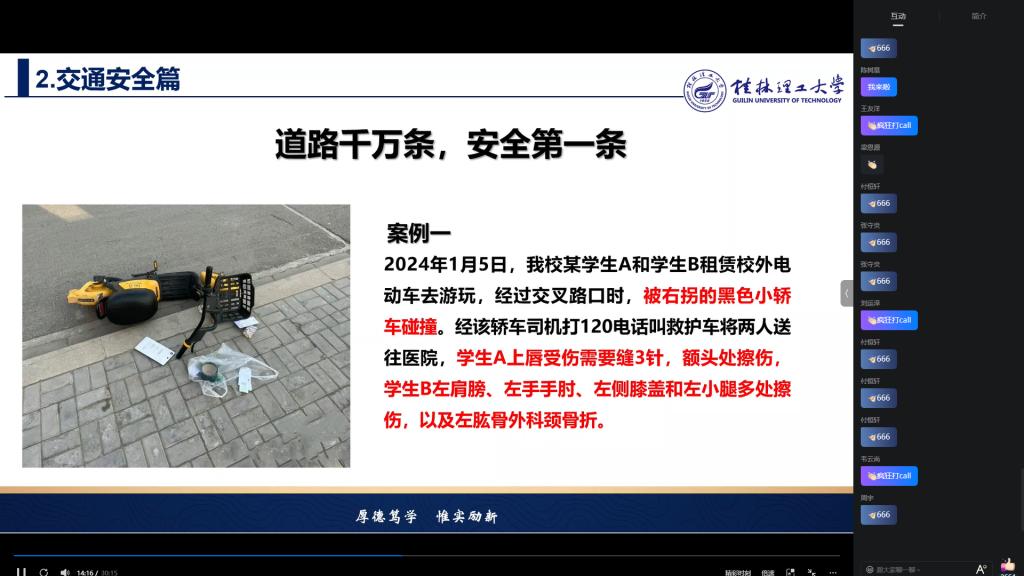 活动伊始,刘浏老师向同学们深入讲解了道路交通安全法规知识,详细阐述了驾乘非机动车不佩戴安全帽、驾驶机动车不系安全带、超速、超载、无证驾驶等交通违法行为的危害及其可能产生的严重后果,并结合实际案例进行深入剖析,使同学们深刻领悟到交通安全的至关重要性。