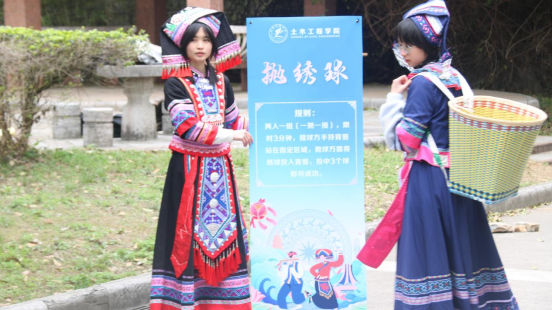 活动以“抛绣球”“竹竿舞”“板鞋竞速”“民俗美食”等特色项目为核心,将民族文化与趣味互动巧妙结合。在抛绣球体验区,同学们两人一组默契配合,挑战精准投掷;竹竿舞区域则充满欢声笑语,参与者在竹竿开合间灵活跳跃,感受壮族舞蹈的独特韵律;板鞋竞速赛场上,三人一组的团队协作充分展现了拼搏精神。此外,五色糯米饭、青团等壮族特色美食的品尝区人气火爆,身着民族服饰的工作人员还为宿舍区的同学送去节日美食,让校园处处洋溢着“三月三”的喜庆氛围。
