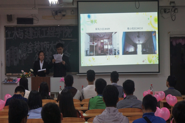 本次宿舍装饰大赛设置一等奖两名、二等奖四名、三等奖六名、创意奖、布局奖、环保奖、色彩奖各两名,由辅导员陈宣东老师对获奖宿舍进行颁奖,其中屏风校区4#408和雁山校区26#209荣获一等奖,同时得到了价值500元的奖品。获奖宿舍不仅收获了荣誉和奖品,还在装饰宿舍的过程中收获一份快乐与温馨。大会最后,宿管委主任田昕炜将自己在本次大赛中的装饰心得分享给大家,宣扬“宿舍为家”的理念,并组织了现场微信投票活动,让大家推选出最心仪的宿舍参加校级宿舍装饰大赛。