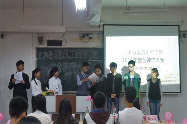 11月4日晚上,由太阳成集团122ccvip宿舍管理委员会举办的宿舍装饰大赛颁奖大会在雁山校区06401教室隆重举行。出席本次大会的嘉宾有土建学院辅导员陈宣东、学生会主席蓝智勇、青年自强社社长崔炎宗、材料学院社区成长工作营主任覃聪、宿管委主任田昕炜,同时2016级各宿舍代表也参加本次大会。
