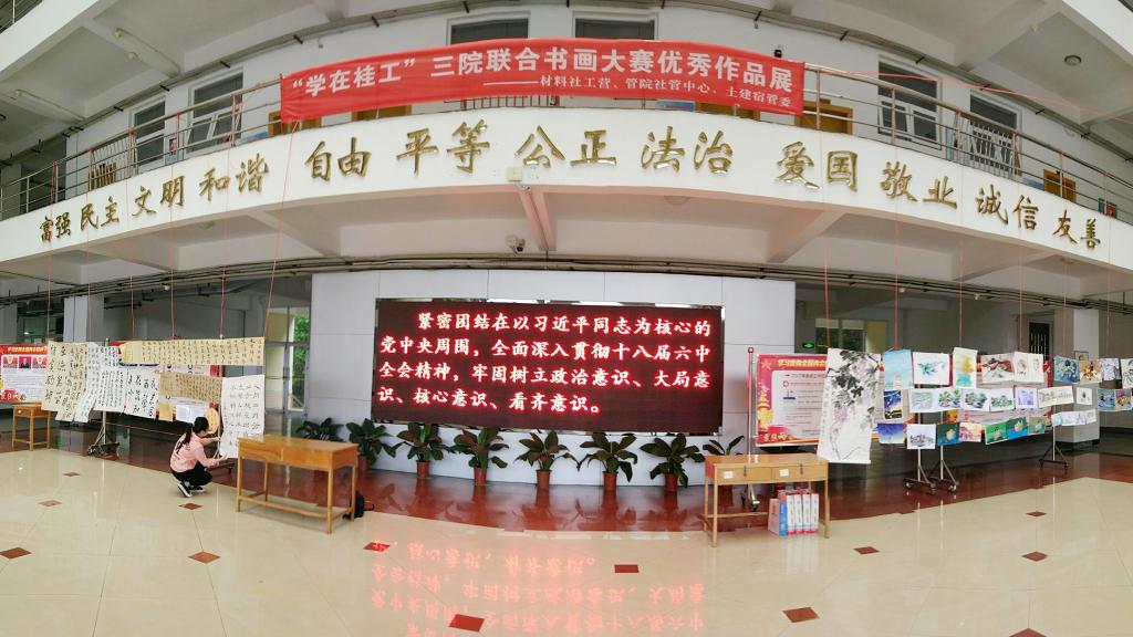 为积极营造“学在桂工”良好氛围,丰富大学生校园文化生活,4月26日至27日,由土建学院宿舍管理委员会、管理学院社管中心和材料学院社工营联合举办,主题为“学在桂工,书画神韵,你我指间”三院书画大赛优秀作品展在屏风校区九栋教学楼大厅成功展出。