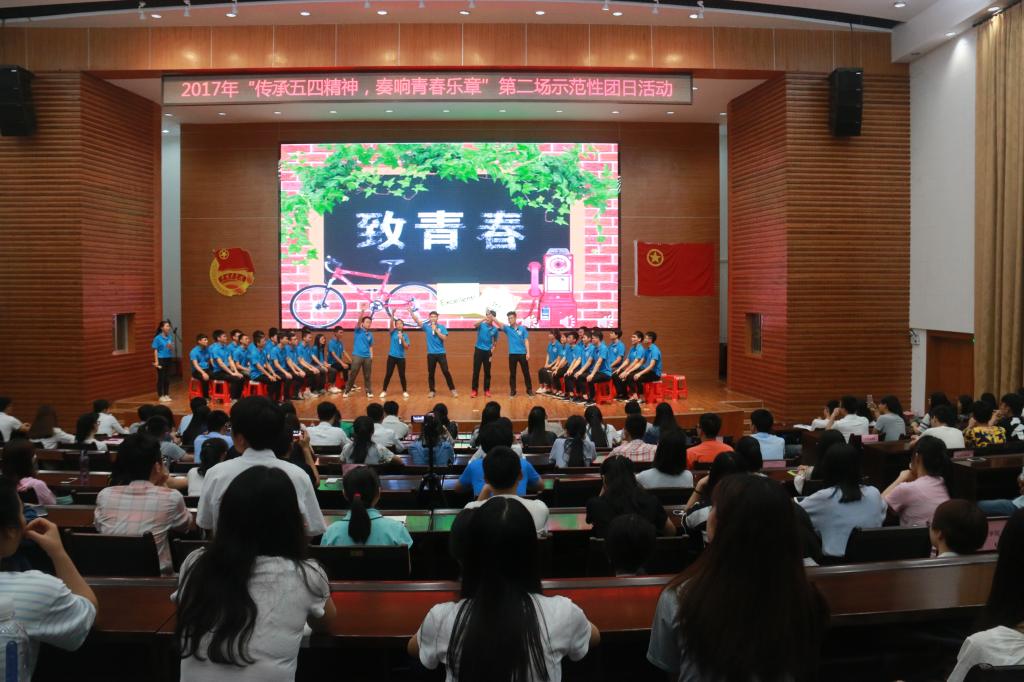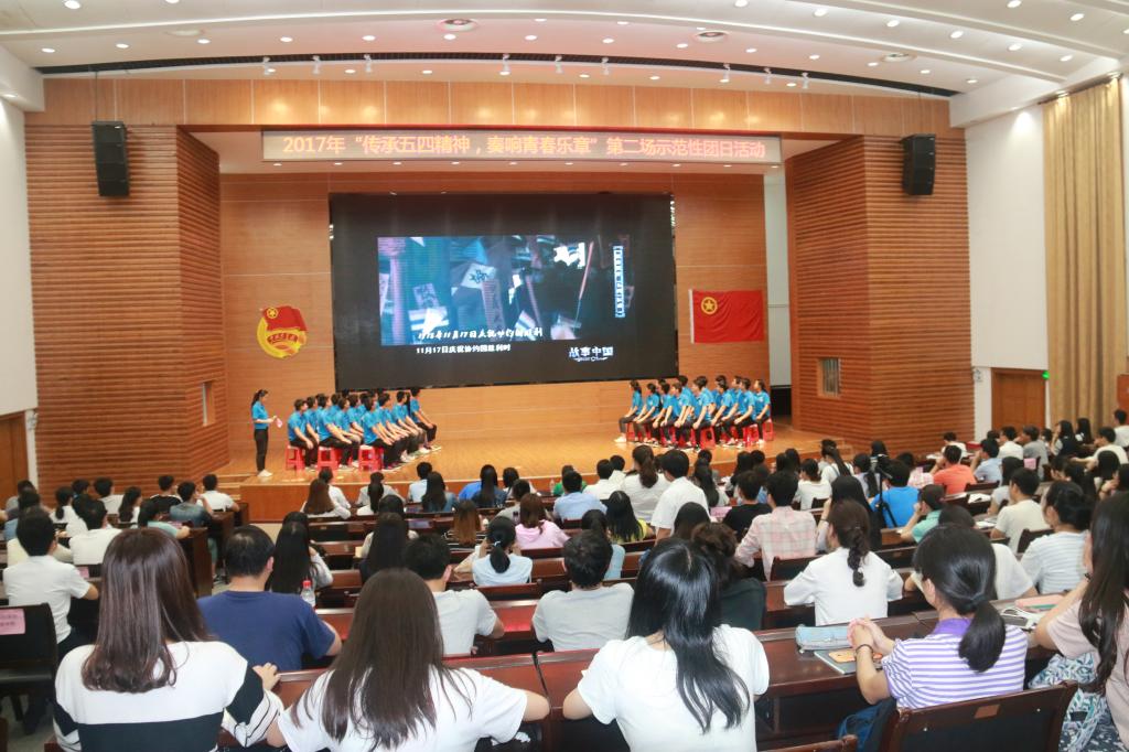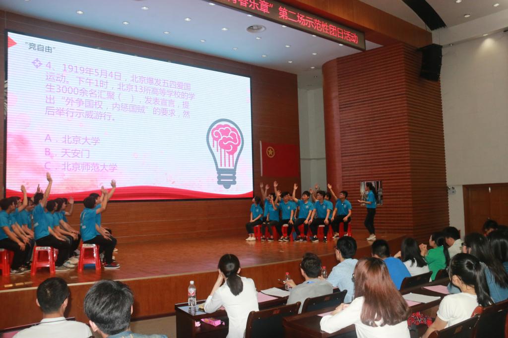 在青春昂扬的《光荣啊,中国共青团》中团日活动拉开了序幕。《故事中国》中暗夜曙光“五四”运动的视频片段,带领学生们一起回顾那98年前发生在北京的一场以青年学生为主,广大群众、市民、工商人士等中下阶层共同参与的,通过示威游行、请愿、罢工、暴力对抗政府等多种形式进行的爱国运动,是中国人民彻底的反对帝国主义、封建主义的爱国运动。看完视频学生们激情澎湃感慨万千,纷纷站起来诉说自己的对于五四运动的看法和认识,分享自己作为新时代青年的应当如何践行社会主义核心价值观。接着诙谐小品——《致青春》将同学们从五四的回忆中带回到现实舞台上。该小品主要通过即将毕业的大学生们面对未来选择的迷茫出发,告诉同学们毕业后除了可以选择就业、继续升学深造、自主创业之外,还有一件有意义值得我们去做的事情那就是用生命的七十分之一的时间去做一件有意义的事情,那就是去做西部计划志愿者。 在团支部全体成员深情朗诵的《少年中国说》中将主题团日活动气氛推向高潮,他们向现场观众展现了一群青年团员的朝气蓬勃精神,也展示了他们作为当代青年为祖国的繁荣昌盛奋发图强的决心。最后在团支书带领全体支部成员重温入团誓词,不忘初心,高举团旗永远跟党走。