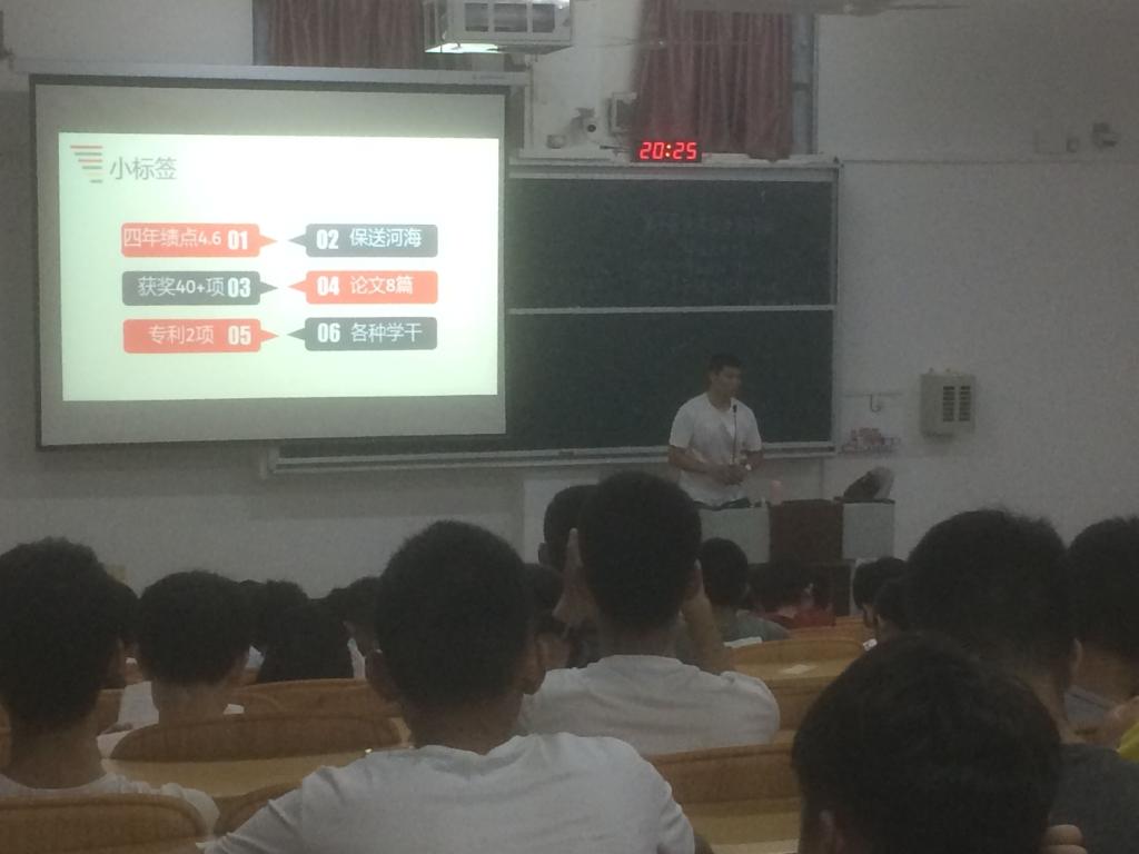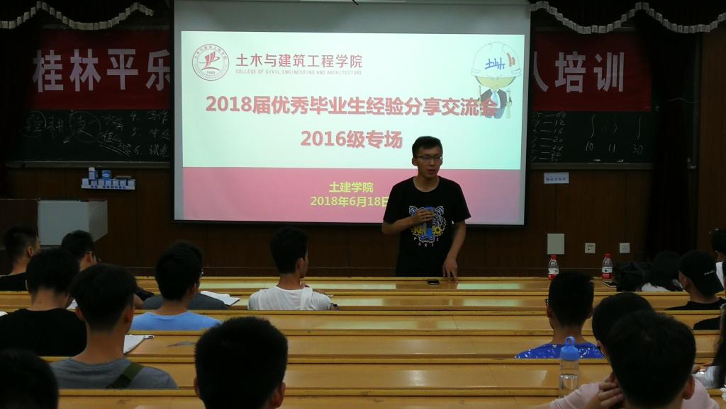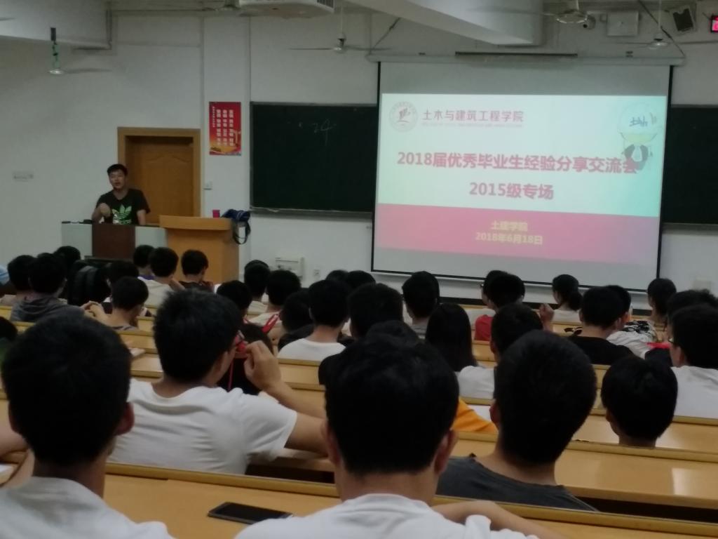 为了将优秀毕业生的成功经验传递和分享给学弟学妹,同时营造良好的毕业生文明离校氛围,土建学院利用成长成才教育课,在6月18日晚上邀请学院2018届毕业生中的全区优秀大学毕业生、优秀学生报告团成员、优秀考研学子、高质量就业毕业生中的代表:詹贺、谢思林、郑杰瑜、张辉、陆润之等同学,分专业、分主题、分年级的给学弟学妹们传授大创申报、互联网+申报、考研准备、就业等经验。