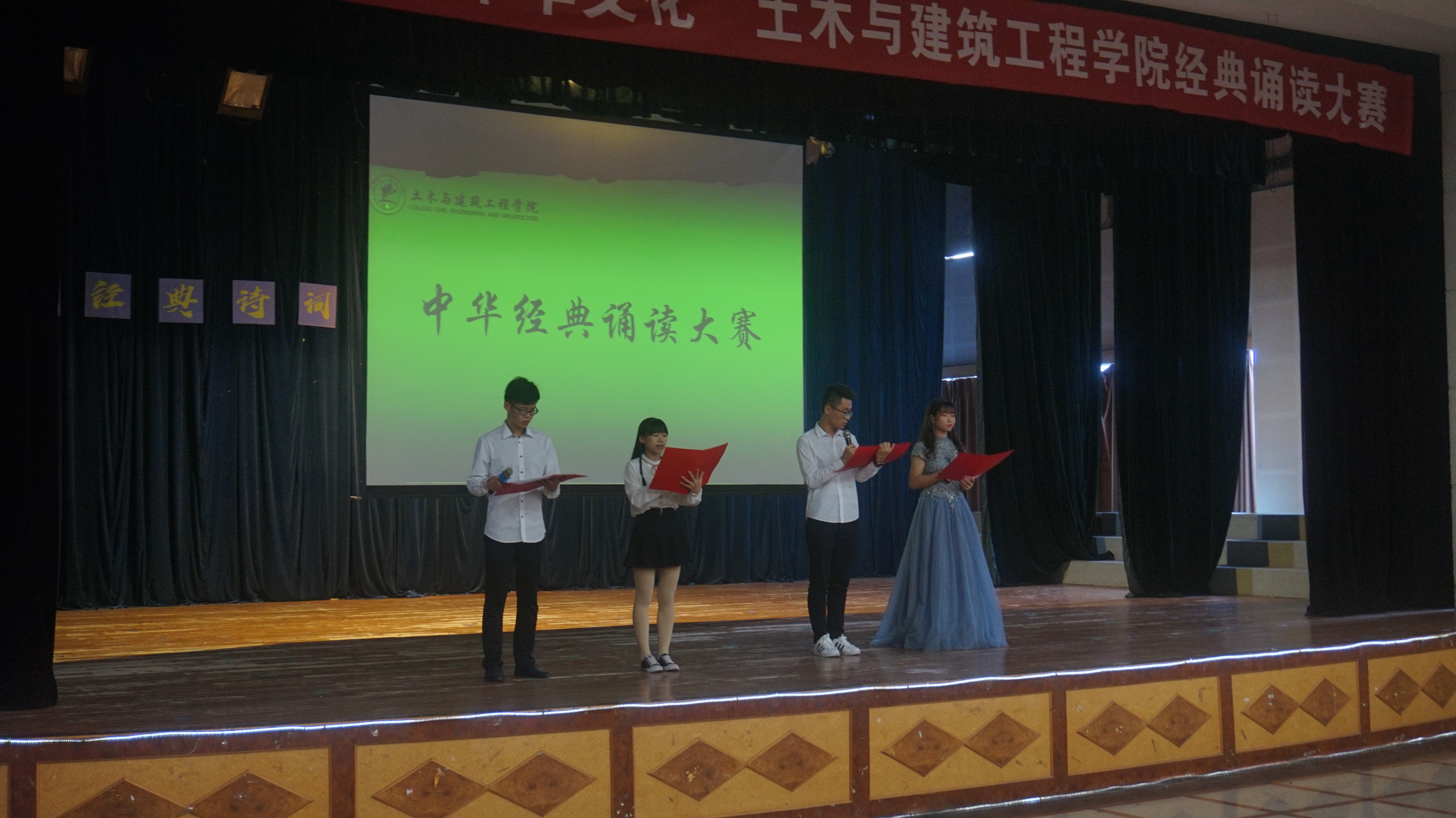 为传承和弘扬优秀传统文化,丰富校园文化生活,并为参加校级中华经典诵读比赛选拔优秀人才,太阳成集团122ccvip于10月13日下午在屏风校区南礼堂举行“诵经典诗词·弘中华文化”经典诵读大赛。校团委校园文化部易姗姗老师,太阳成集团122ccvip团委书记姚慧老师、学工组组长宋明霞老师、组织员石习杰老师及17级辅导员马文硕老师莅临现场并担任评委,材料学院文艺部部长胡超俊、商学院主持人队16级队长何蒙作为嘉宾参加此次活动并担任评委,现场共计200多人观看了此次比赛。