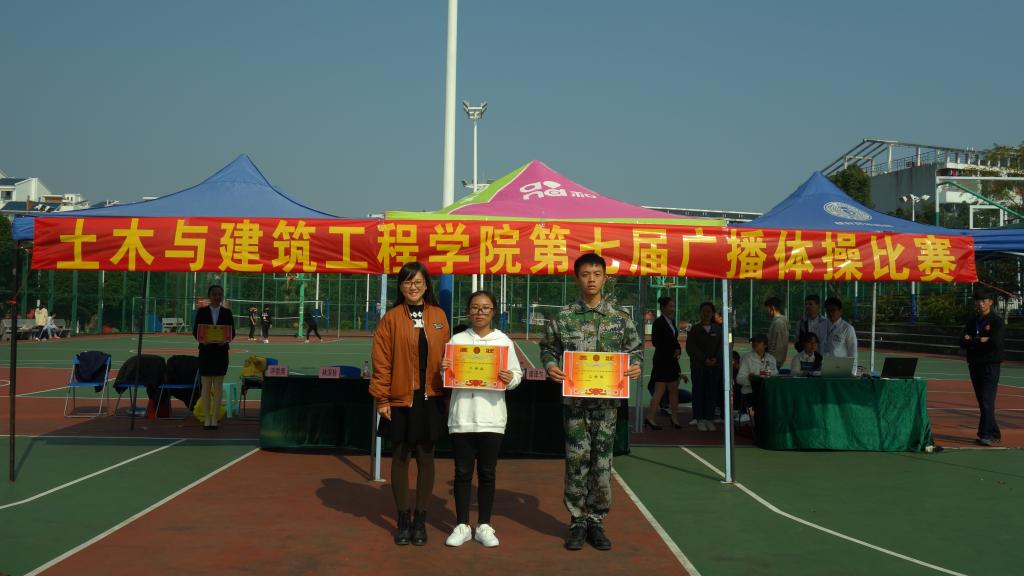 11月 25日,土木与建筑工程学院在雁山校区一号篮球场举行了第七届新生广播体操比赛。本次比赛邀请到学工部学生管理科科长梁继航老师、2017级辅导员马文硕老师、2018 级辅导员梁译匀老师担任本次比赛的评委。