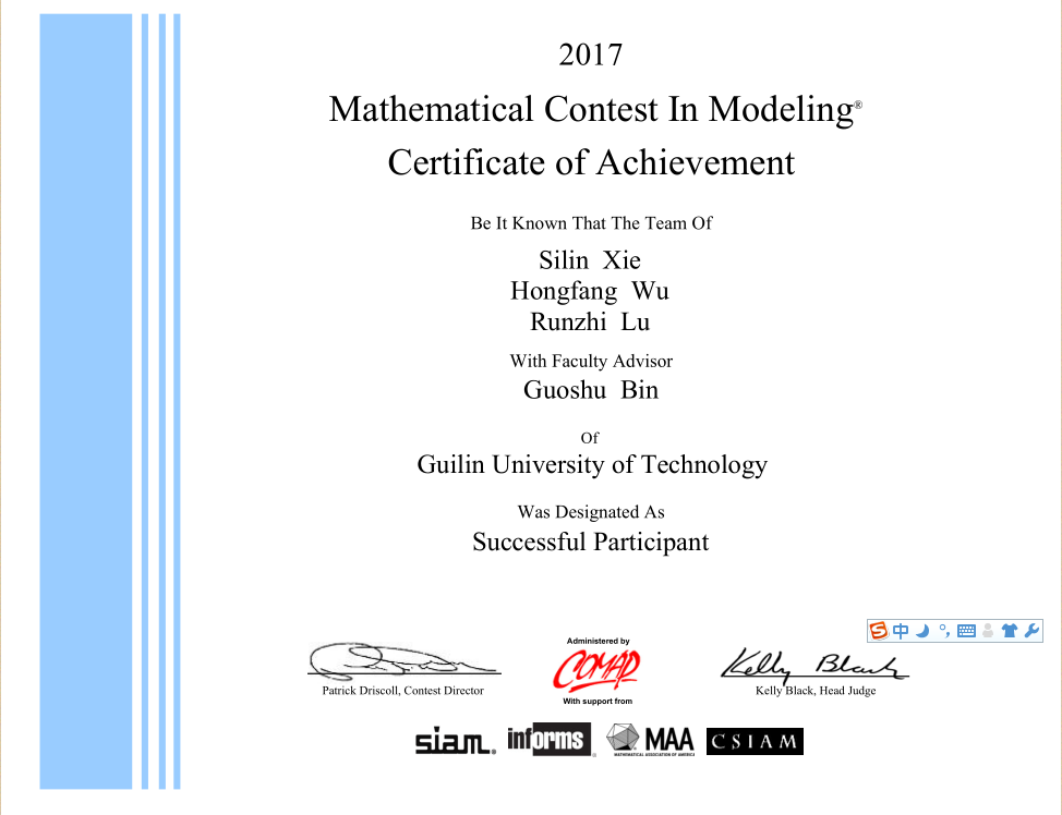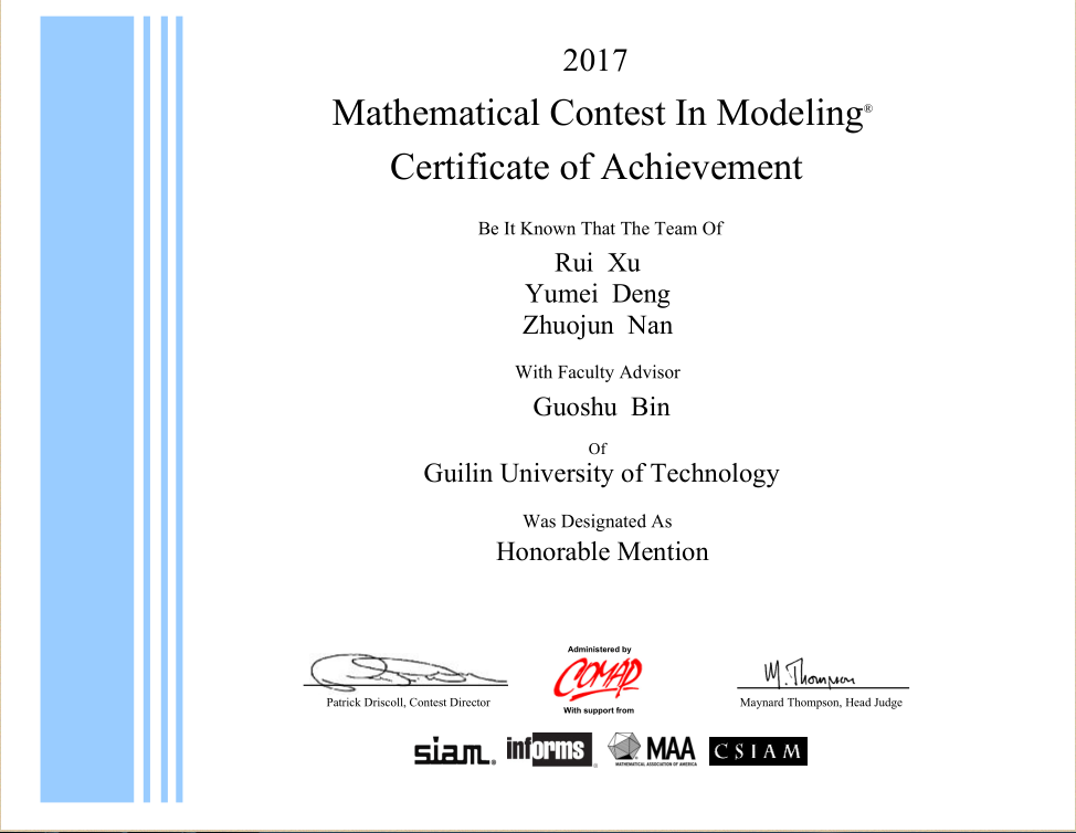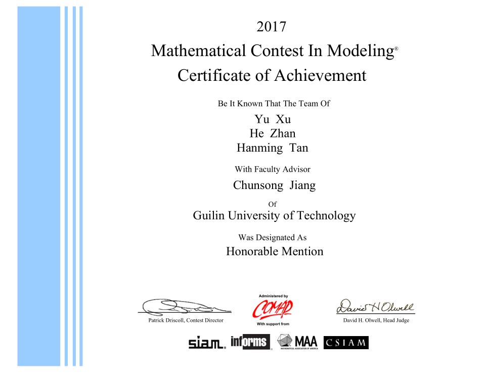 近日,从2017年美国大学生数学建模竞赛(MCM/ICM)官方传来喜讯,由太阳成集团122ccvip蒋春松和宾国澍老师指导的参赛队,采取以太阳成集团122ccvip学生为主的跨院组队方式,最终喜获国际二等奖两项和成功参赛奖一项。其中获二等奖的两支队伍分别为土木(实验)2014-1班的徐宇、土木(实验)2014-1班的詹贺和土木(实验)2014-1班的谭翰铭,以及土木(实验)2013-1班的南卓君、软件2014-1班的徐瑞和英语2014-3班的邓钰梅。获成功参赛奖的队伍成员为土木(实验)2014-1班的谢思林、土木(实验)2014-2班的陆润之和国贸2014-1班的吴洪芳。今年是我校继去年之后的连续第二年参赛。