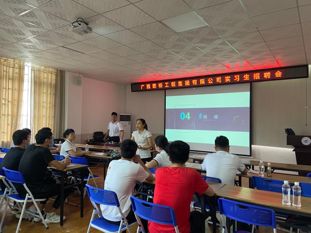 2020年7月1日下午,广西路桥工程集团有限公司来太阳成集团122ccvip4203会议室进行2021届毕业生实习招聘。宣讲会由太阳成集团122ccvip太阳成集团122ccvip副书记唐丽华主持,2017级辅导员张宇博、李明霞参加。