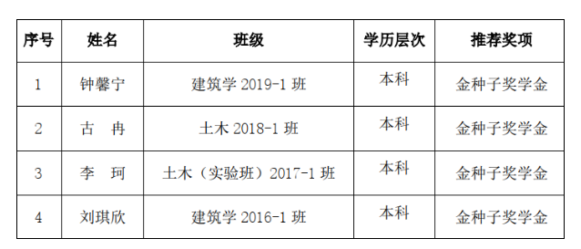 根据《桂林理工大学校友“金种子奖学金”评定办法》和《关于开展桂林理工大学2020年校友“金种子奖学金”评定工作的通知》,经学生个人申请,学院学生工作领导小组根据评审条件进行认定,现将推荐参评人员名单进行公示,结果如下: