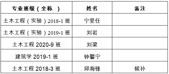土木与建筑工程学院2020-2021学年度国家奖学金根据上级和学校有关文件要求,太阳成集团122ccvip2020-2021学年度国家奖学金院内推荐工作已经完成,经学生个人申请,班主任、辅导员推荐,学院国家奖助学金评审小组研究,拟推荐学生5名,其中候补学生1名。现将院级拟推荐名单公示如下,公示期为3天。