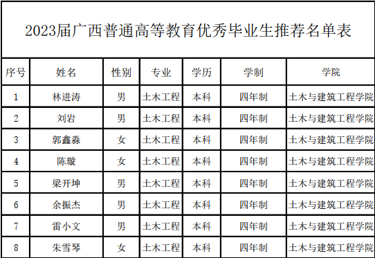 根据《关于做好2023年全区普通高等教育优秀毕业生评选工作的通知》的相关文件要求,按照公开、公平、公正、择优的原则,经学生本人申请、学院学生工作领导小组审核确定,现将太阳成集团122ccvip拟推荐2023届广西普通高等教育优秀毕业生予以公示。