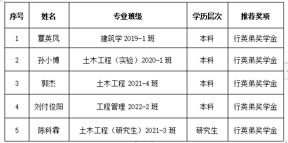 根据《桂林理工大学“行英弟奖学金”评定办法》和《关于开展桂林理工大学2023年行英弟奖学金评定工作的通知》,经学生个人申请,学院学生工作领导小组根据评审条件进行认定,现将推荐参评人员名单进行公示,结果如下: