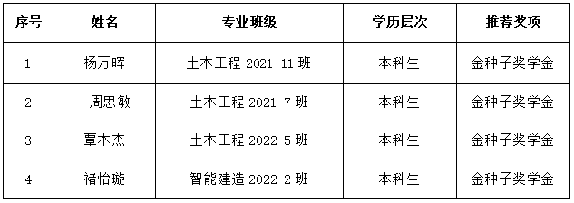 根据《桂林理工大学校友“金种子奖学金”评定办法》和《关于开展桂林理工大学2024年校友金种子奖学金评定工作的通知》,经学生个人申请,学院学生工作领导小组根据评审条件进行认定,现将推荐参评人员名单进行公示,结果如下: