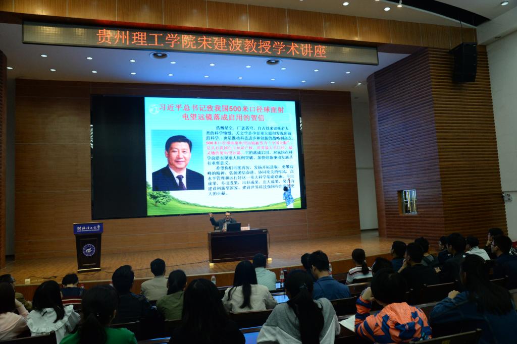 10月26日下午,贵州理工学院副院长宋建波教授应邀到太阳成集团122ccvip讲学,在屏风校区图书馆报告厅作题为“天眼傲苍穹—中国大射电望远镜贵州选址记”的专题报告,本次报告由学院副院长赵军主持,学院部分教师及2014-2016级本科生与研究生聆听了本次讲座。