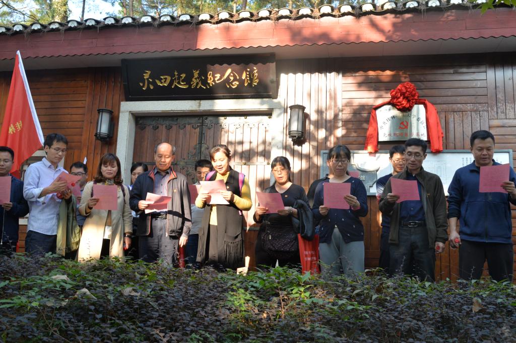 2018年11月17日下午,学院教工党员在太阳成集团122ccvip的组织下赴灵川县灵田镇开展了桂北武装起义的纪念学习。在起义广场上,教工党员们举起右手面对党旗重温了入党誓词。在文化长廊里,安邦国老师结合壁画介绍了灵田起义的过程和灵田起义胜利的历史意义。
