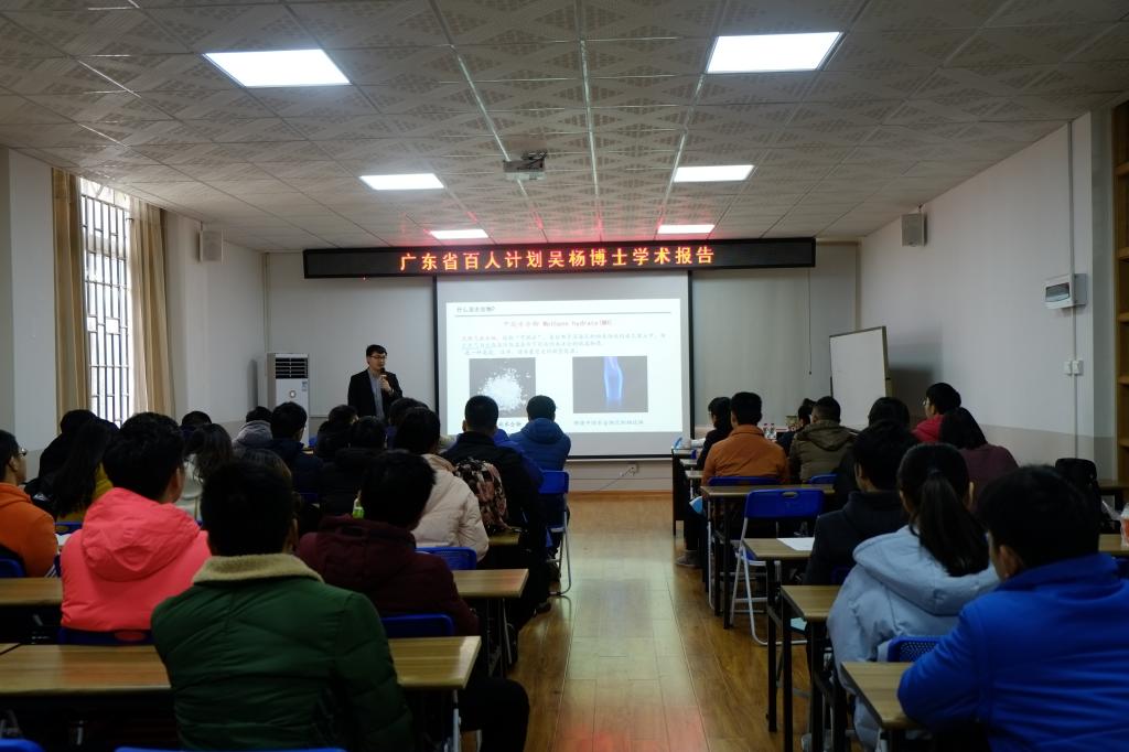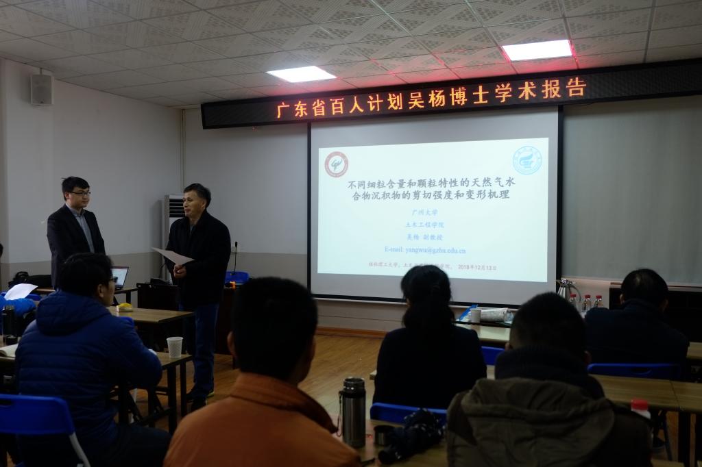 2018年12月13日,上午9:30-10:30在教学楼4203开展了吴杨博士题为《不同细粒含量和颗粒特征的天然气水合物沉积物的剪切强度和变形机理》的学术报告。