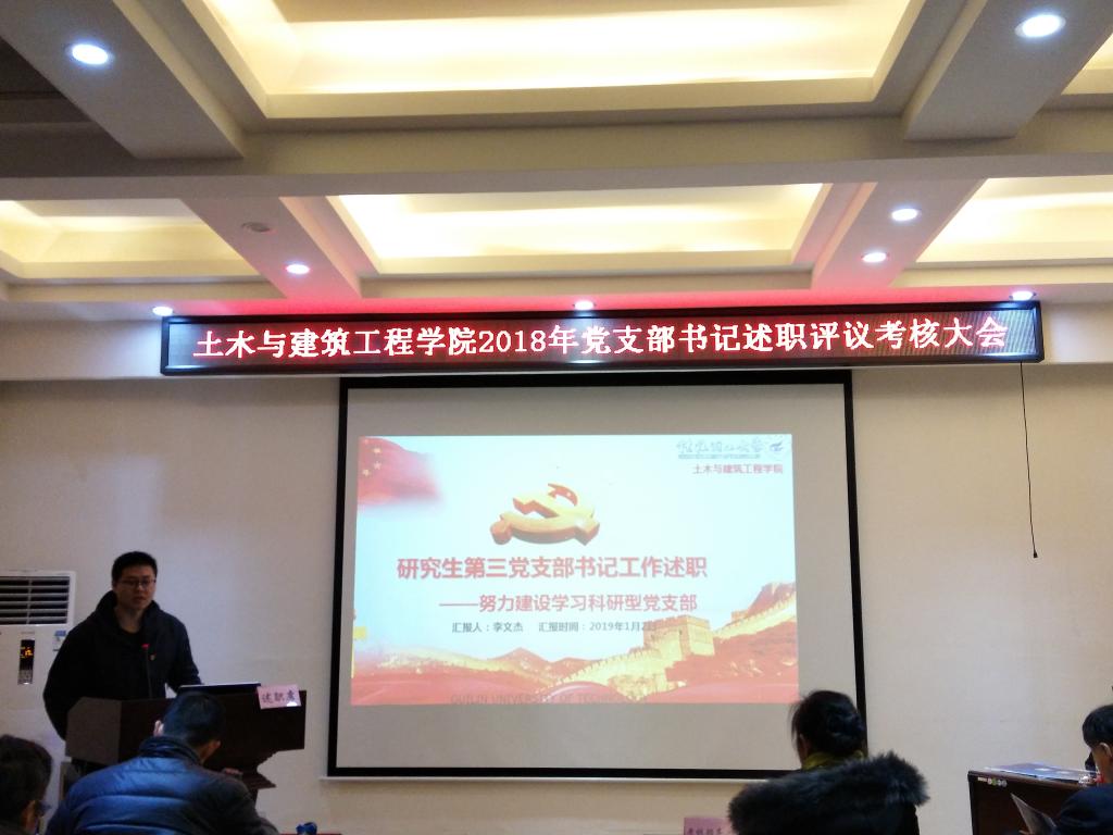 述职评议考核会上,16名师生党支部书记对2018年抓党建工作情况进行了述职。党支部述职重点涉及学习贯彻习近平新时代中国特色社会主义思想和党的十九大精神,推进“两学一做”学习教育常态化制度化;提高党支部建设质量,落实基层党建工作重点任务;强化党支部政治功能、完成重大任务情况;履行党支部书记第一责任人职责,强化党支委班子建设;党支部“强基固本”工程、“三会一课”等基层党建工作方面落实情况。