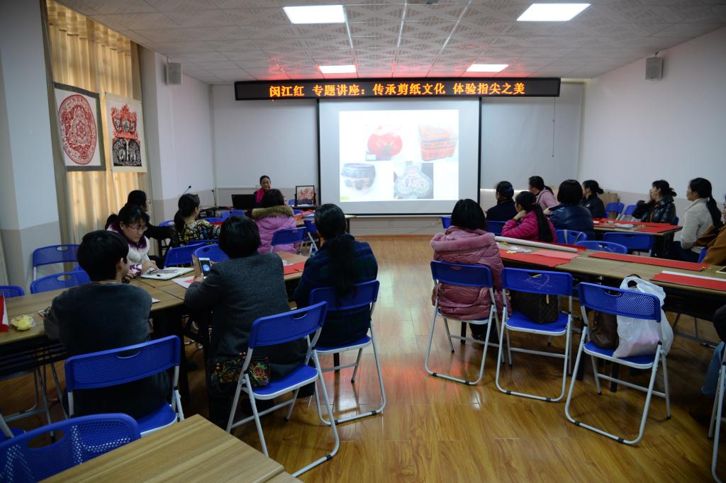 中国国际剪纸协会理事、广西高级工艺美术师、桂林理工大学剪纸协会执导老师闵江红老师为女同胞们带来了专题讲座:体验剪纸“会飞的花”——传承剪纸文化 · 体验指尖之美。通过培训,老师们了解了剪纸语言:纹,剪纸艺术的来源,剪纸与现代生活及现代艺术的融合,体验了指尖之美。