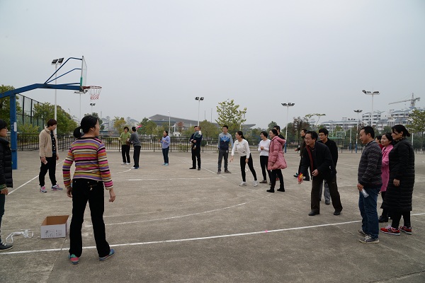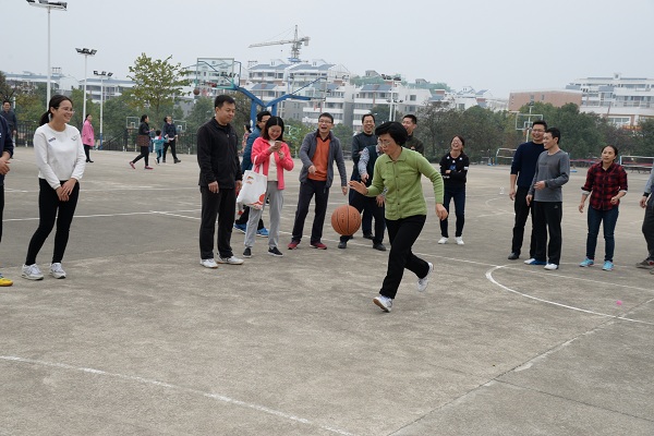参观完校史馆后,学院在篮球场进行了教职工趣味活动比赛。本次趣味活动比赛共设3个集体项目,分别为运球投篮、丢毽子、“国球”接力。教职工通过随机抽签分成9个组。各组指定组长和副组长,负责组织本组队员参赛。