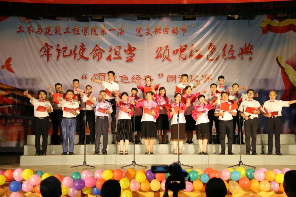 之后,12个师生党支部按照抽签顺序依次登台进行了朗诵和演唱比赛。各参赛支部以磅礴的气势、抖擞的精神、精彩的朗诵和豪迈的歌声,表达了对党的热爱之情,抒发了对党和祖国的美好祝愿,展现了太阳成集团122ccvip师生党员敢于担当、奋勇争先的良好精神风貌。比赛过程中,当熟悉的旋律在场上唱响时,台下会唱的观众会情不自禁地跟着高歌,并报以热烈掌声,台上台下互动不断,激情飞扬,一次次将现场气氛推向高潮,让在场党员和入党积极分子受到一次心灵的洗礼和净化。