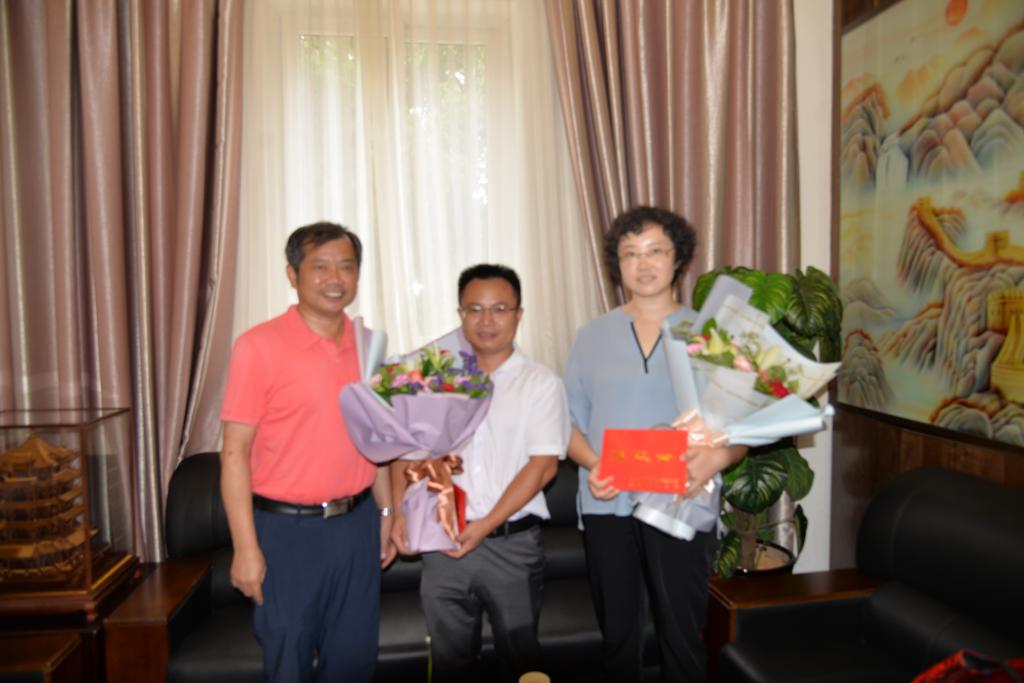 校领导与教师代表亲切合影,并送上节日鲜花和慰问金,同时对两位老师的生活、工作表示了关心。会谈中,陈副校长强调要继续发挥自身的优势,提高学术水平,同时要带动学院其他教师积极加入到做科研的队伍中去。在此过程中两位老师表示要扎实开展本职工作,积极营造学院的科研氛围,努力为学院、学校的发展做贡献。