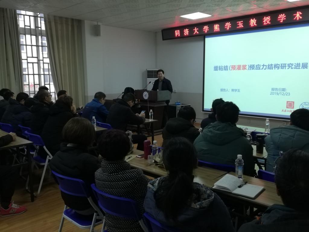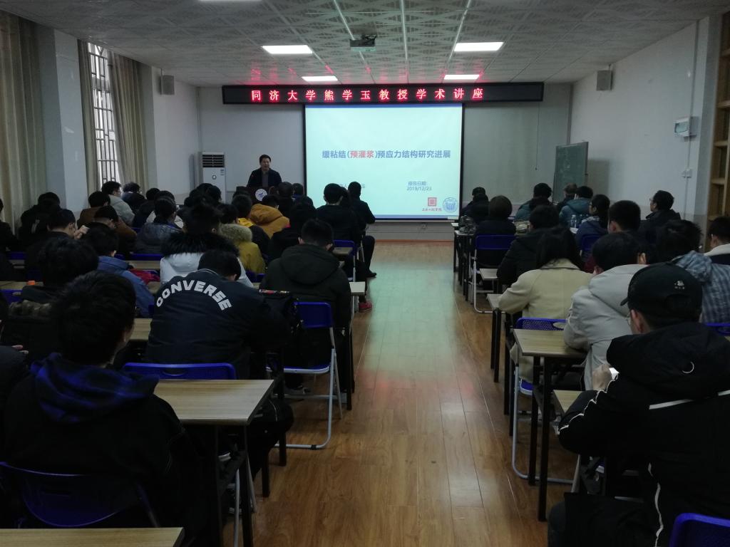 会上,熊学玉教授首先向与会师生介绍了预应力混凝土结构及其应用研究的背景,并通过英国Ynys-y-Gwas桥梁事故具体说明了目前80%传统后张有粘结预应力混凝土结构都存在安全隐患现状。随后,熊教授结合相关试验数据与具体图例,对缓粘结预应力、缓粘结预应力混凝土梁的静力试验、疲劳试验、缓粘结预应力筋粘结性能实验、耐久性试验以及高性能缓粘结预应力筋材料几方面进行阐述。最后,熊教授同与会师生就相关的学术问题进行了良好的交流互动。