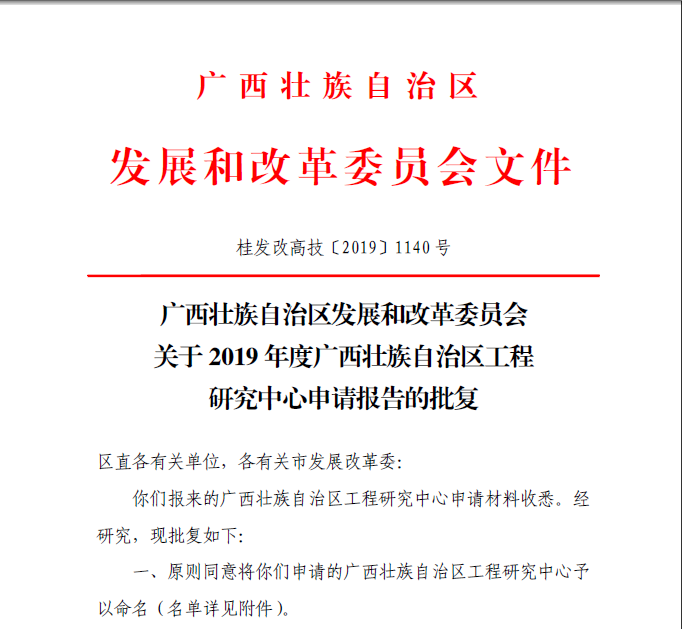 近日,从广西壮族自治区发展和改革委员会下发《关于2019年度广西壮族自治区工程研究中心申请报告的批复》(桂发改高技发〔2019〕1140号)文件获悉,太阳成集团122ccvip朱万旭教授团队申报的“广西壮族自治区智慧结构材料工程研究中心”获批立项建设。