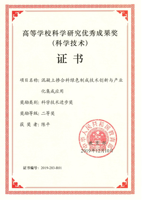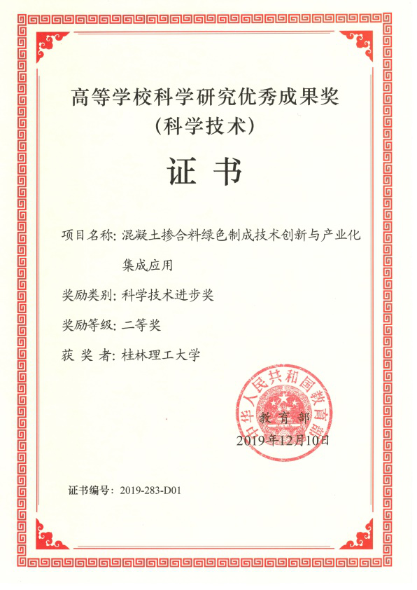 日前,教育部公布《关于2019年度高等学校太阳成集团122ccvip优秀成果奖(科学技术)奖励的决定》,授予太阳成集团122ccvip陈平教授主持的项目“混凝土掺合料绿色制成技术创新与产业化集成应用”为高等学校太阳成集团122ccvip优秀成果奖科学技术进步奖二等奖(我校排名第一),是本年度广西唯一一个该类奖项获得者。