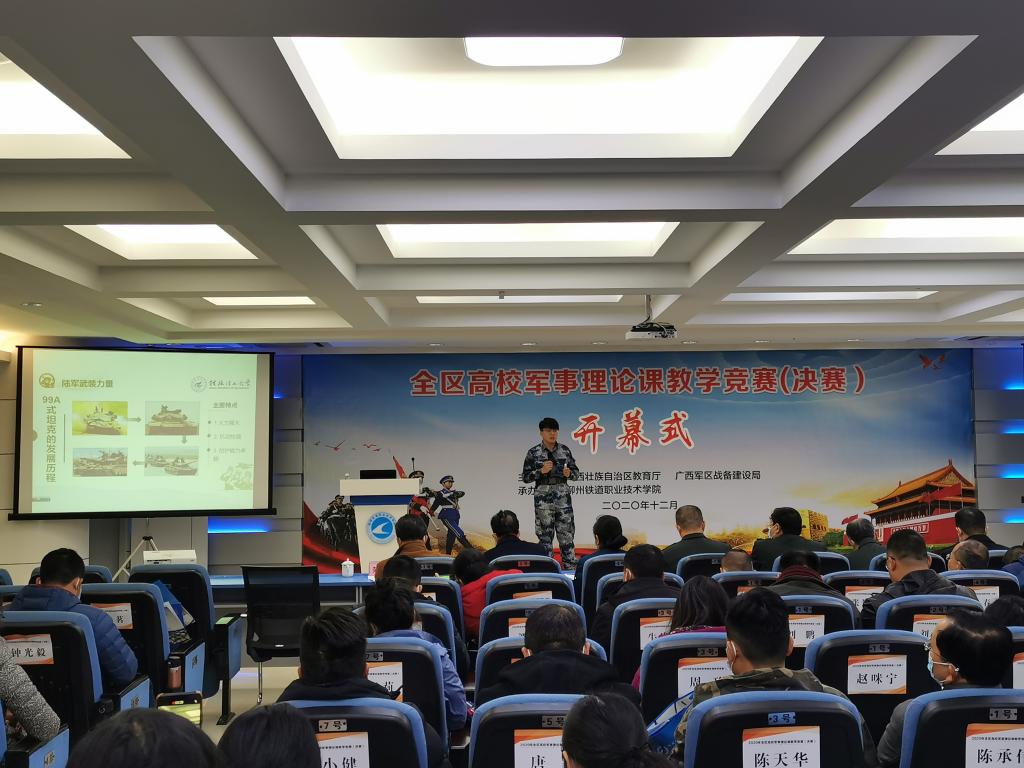 本次比赛由广西壮族自治区教育厅、广西军区战备建设局主办,柳州铁路运输学院承办,比赛分为初赛、决赛两个阶段,初赛是由各高校推荐参赛教师的讲课视频,全区高等学校共有189位老师参加,初赛光碟由国防大学组织人员评审,并在189位老师报送的光碟中评出25位优胜者参加决赛。现场决赛在柳州铁路运输学院举办,进入决赛的25名教师进行现场授课,评委根据参赛教师授课情况现场评分,并公布竞赛结果。