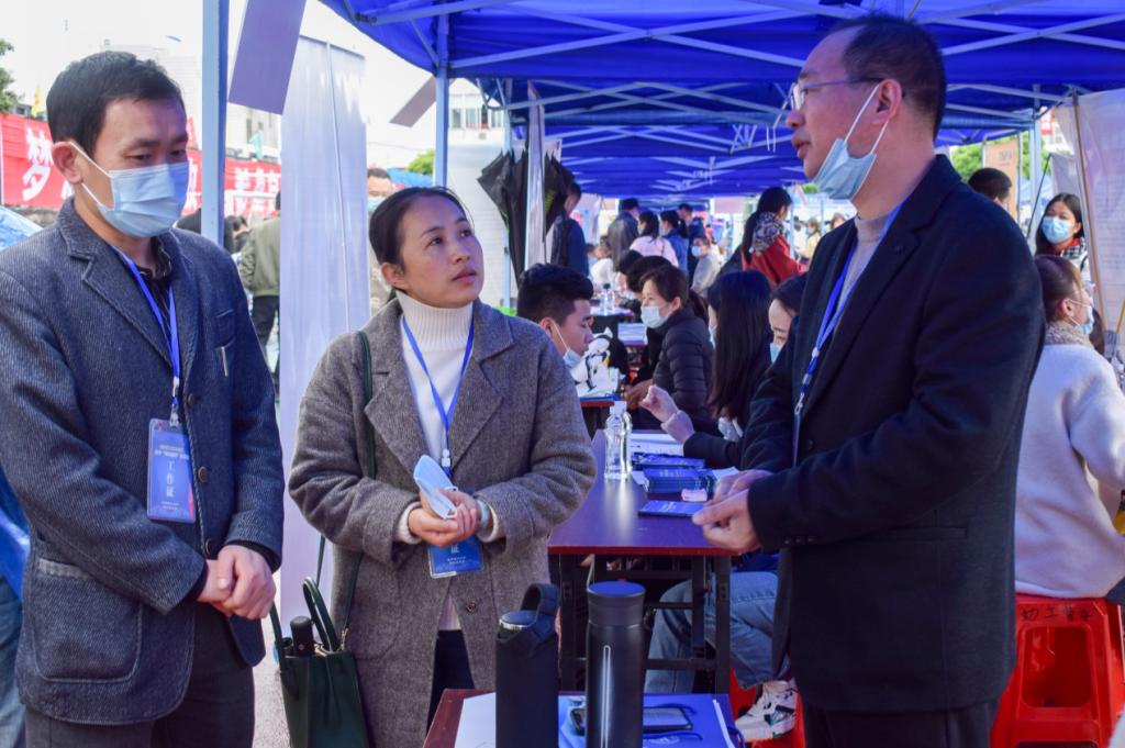 当日上午,唐丽华、虞爱平一行来到双选会现场,深入走访广西华景城建筑设计有限公司、广西鱼峰集团有限公司等相关用人单位招聘现场,了解用人单位岗位需求,鼓励参加双选会的毕业生积极向单位介绍自己,争取就业岗位,并亲自指导毕业生面试、签约。
