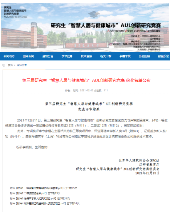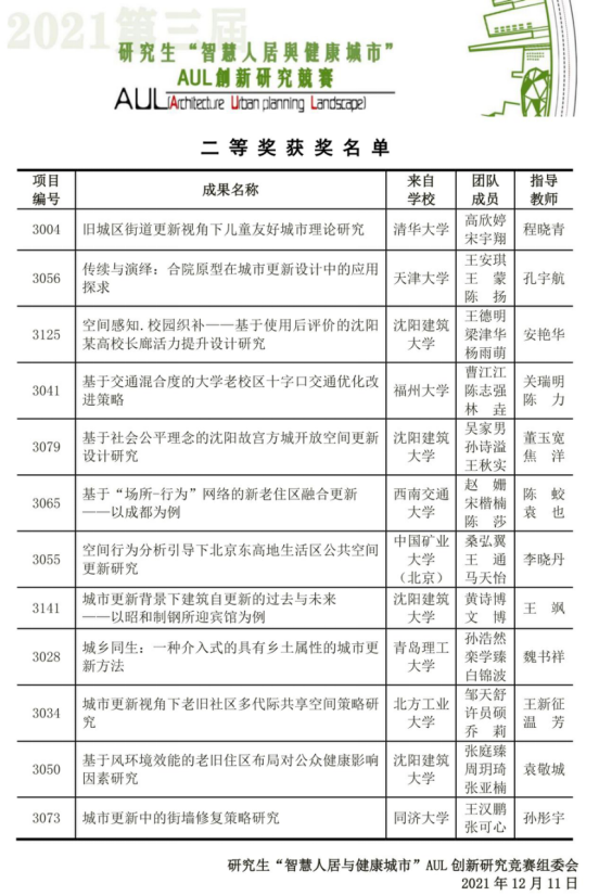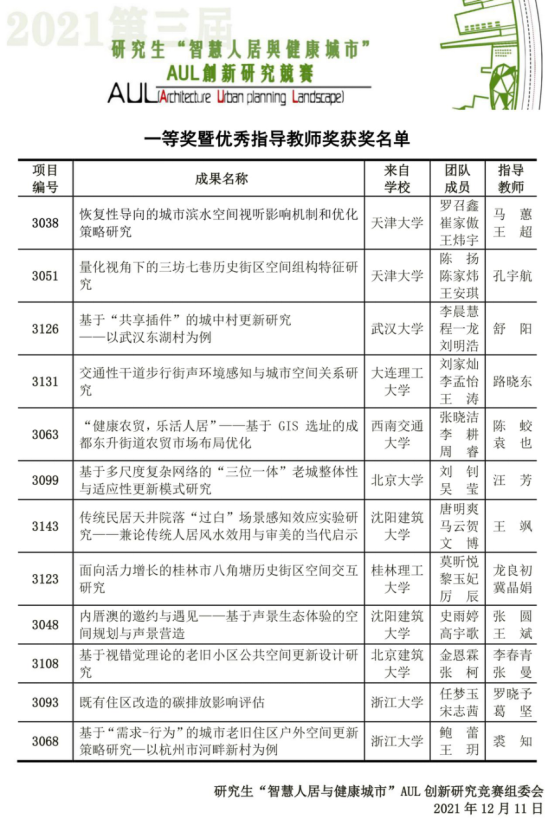 2021年12月11日,第三届研究生“智慧人居与健康城市”AUL创新研究竞赛圆满落下帷幕。竞赛活动由世界华人建筑师协会(WACA)、辽宁省教育联合主办。本届竞赛分为初赛、决赛两部分。初赛经专家评审,来自清华大学、北京大学、天津大学、同济大学、浙江大学、桂林理工大学、沈阳建筑大学等院校的24项研究成果,作为一等奖候选项目进入决赛。据悉,入围团队中博士研究生占比10%。