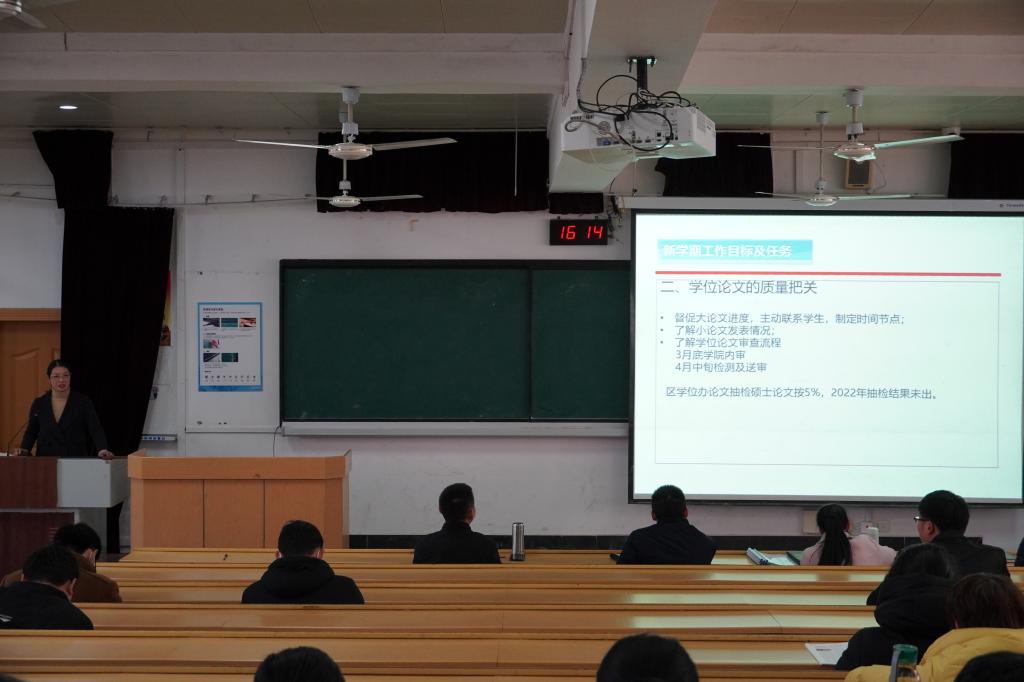 根据学校《关于进一步加强对2023届毕业研究生学位论文质量管理的通知》要求,学院2023年2月24日下午15:30在屏风9101召开学院全体教职工会议。其中学院研究生工作部署中,分管领导邓春凤副院长设置专题模块,对硕士研究生论文质量把控进行文件精神传达、讲解和分析。反馈了太阳成集团122ccvip近2年来关于硕士研究生论文质量把控措施及成效。