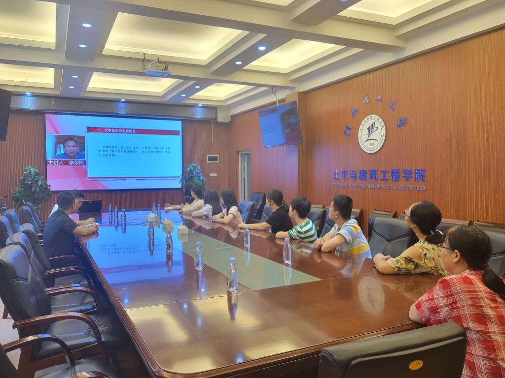 李教授结合自身教学经验和感受,重点从大学教师提升政治性、奉献性、专业性以及主动性等四个方面的素养和能力分享了为人为师者的感悟,他认为高校教师不仅要上好课,培养好学生,做好学问,还要做好服务社会工作,承担起自身的社会责任。