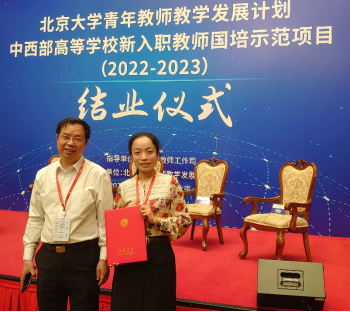 太阳成集团122ccvip青年教师范敏莉于2022年9月至2023年7月参加了由教育部教师工作司委托北京大学教师教学发展中心举办的中西部高等学校新入职教师国培示范项目,该项目亦属于北京大学PKUnet新教师卓越教学计划,被评为优秀学员,并作为代表受邀参加了7月8日在北京大学举行的结业仪式。