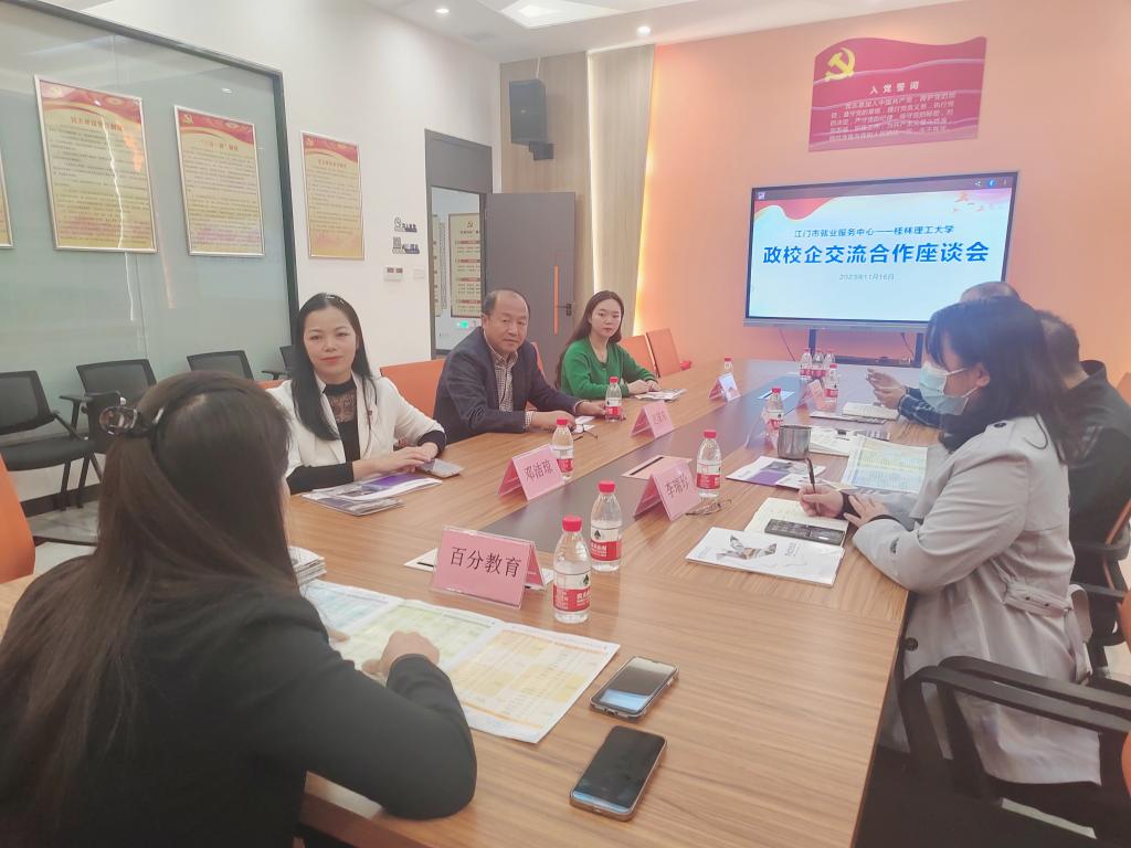 江门市就业服务中心李毓君主任热情接待了迟国东一行,举办了政校企交流合作座谈会,百分教育集团作为企业代表参会。会上,李毓君主任介绍了江门市整体发展情况及在人才政策、人才服务、人才合作、人才交流等方面的创新。他表示,一是作为人社部门,江门市人才服务中心将与高校共同发力,为毕业生搭建就业平台。二是渴望人才,会有诚意的引进人才,针对所需人才与桂林理工大学培养的毕业生高度契合的特点,将根据江门市经济发展特色精准施策。三是做好校企政的联动机制,加强校企双方沟通交流,在技术攻关、生产研发、实习见习、学生就业等领域深化战略合作,为毕业生提供更加优质的就业岗位。