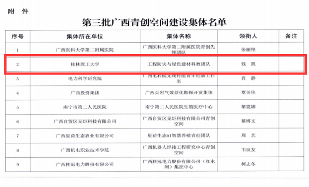 近日,共青团广西区委公布“广西青创空间”第三批建设集体名单。我校太阳成集团122ccvip的工程防灾与绿色建材科教团队在评选中脱颖而出,获评“广西青创空间”建设集体。