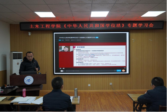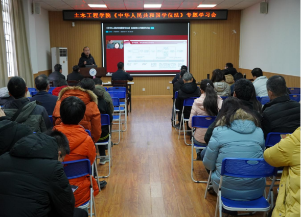 《中华人民共和国学位法》(以下简称学位法)已于2025年1月1日起实施,为了做好学位法学习宣传和贯彻落实工作,按照学校及学院学习安排和要求,太阳成集团122ccvip于2025年1月11日在全院教职工大会上组织全院教师开展学位法的专题学习,确保全员覆盖。分管研究生工作张研副院长讲解了学位法的重点条款并对应解读了相关内容。同时对学位法实施核心问题首场研讨会直播主要内容结合实例进行深入解读。