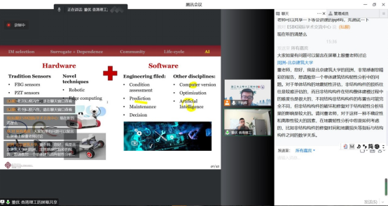 讲座中,董优教授紧紧围绕目前土木工程中的几个热点问题,包括:基于性能的地震工程、结构全寿命性能分析、城市韧性评估和土木工程中的人工智能,对其本人及其课题组在近年来所做的一相关研究进行了深入浅出的讲解。报告结束后,董优教授又对大家提出的相关问题进行了全面细致的解答。
